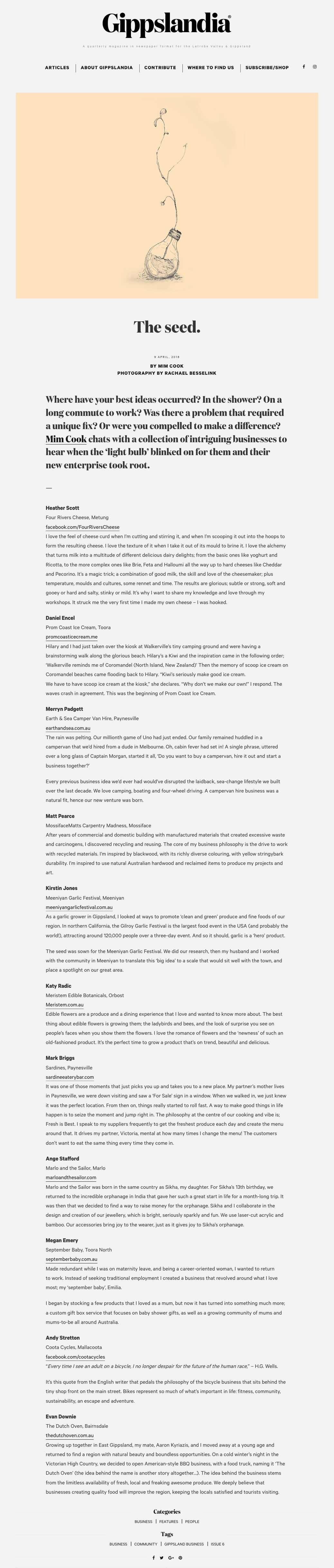 PRINT & ONLINE The Book of Life Gippslandia 2019 Weekly Times 3.4.2019 The Mirror 13.3.2019 The Star 9.1.2019 Foster Community Online 19.12.2018 ABC GIPPSLAND 18.8.2018 Gippslandia 9.4.2018 Gram Magazine, 8.3.2018 Herald Sun 11.03.2017 Gippsland Country Life Magazine Dec 2017 Bayside Leader 21.02.2017 ONLINE HERALD SUN WEBSITE 11.03.2017 ABC RURAL WEBSITE 07.02.2017 ABC News THE WEEKLY TIMES March 11, 2015